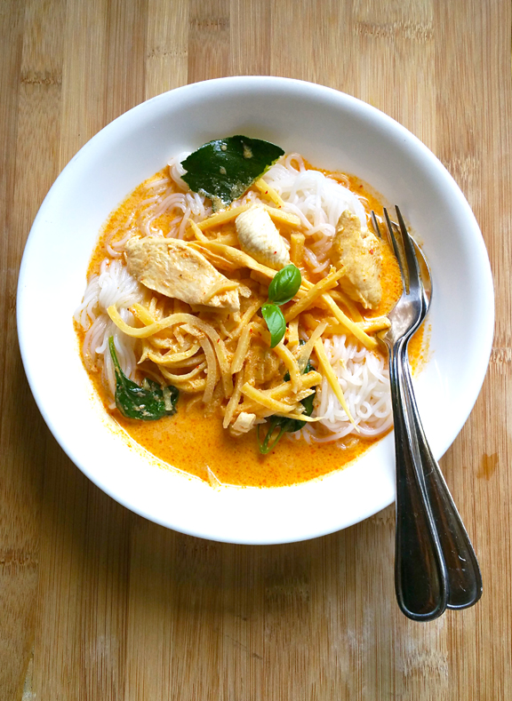 *Arrange them on a plate and top with green curry or red curry. Eat them like you would a plate of rice topped with curry. This is probably one of the most common ways khanom jin is served in Thailand (recipes for both red and green curries are in both Simple Thai Food and Bangkok cookbooks).
