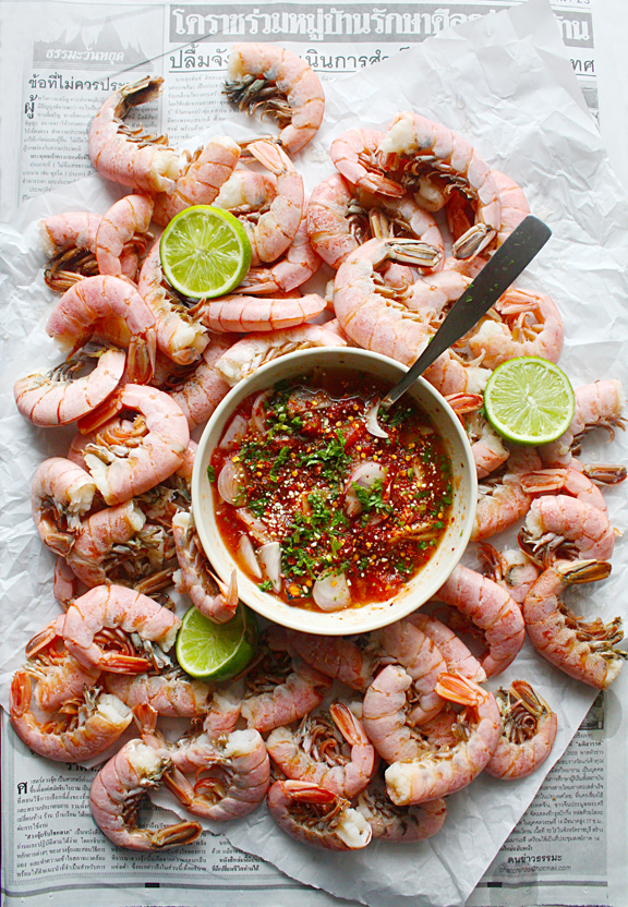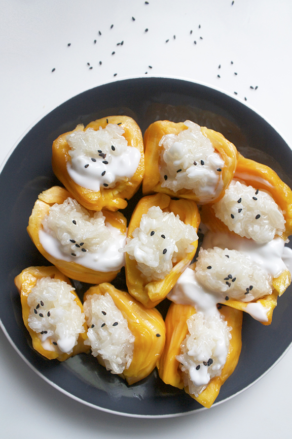 Start off with a fresh batch of sweet coconut sticky rice. Page 161 of Simple Thai Food explains in detail the process of making it. Then you pinch off a small bit of the rice and fill a fresh jackfruit half (you already know how to get the flesh out of a whole jackfruit) with it. The salted coconut cream goes on top. If you’re in Thailand, fried hulled mung beans would be the standard topping; elsewhere, sesame seeds would work just fine.